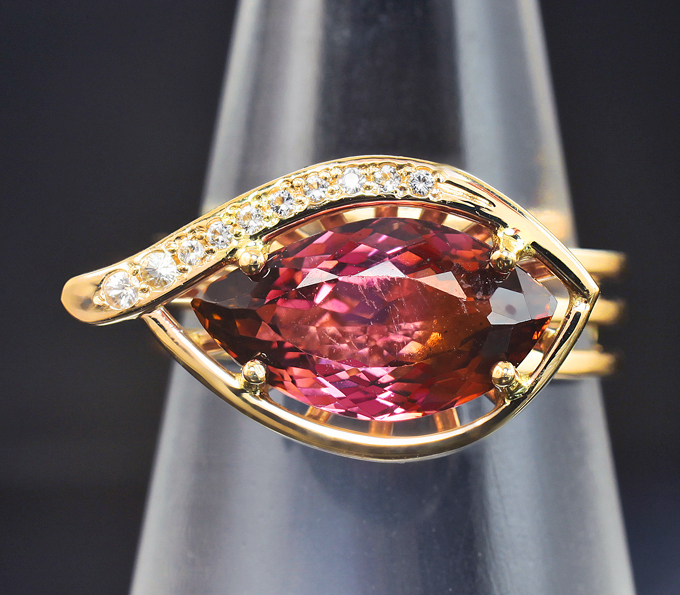 Вашему вниманию предлагается кольцо из желтого золота 585 пробы с полихромным турмалином авторской огранки и лейкосапфирами! Диаметр дополнительной инкрустации 1 мм до 1,3 мм. Площадка 20 х 11 мм, высота 8 мм. Вес изделия 5,2 г. Размер 17,25. Ниже приводятся ювелирные характеристики вставки.