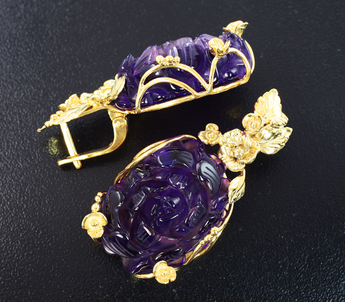 Вашему вниманию предлагаются серьги из стерлингового серебра (925 проба) с резными аметистами 63,25 карата! Изделие позолочено. Размеры вставок 27 х 19 мм. Площадка серег 44 х 20 мм. Вес пары 20,2 г.