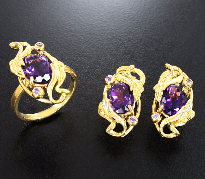 Вашему вниманию предлагается комплект (кольцо + серьги) из стерлингового серебра (925 проба) с аметистами! Изделия позолочены. Диаметр дополнительной инкрустации 2 мм. Вес комплекта 11,9 г.