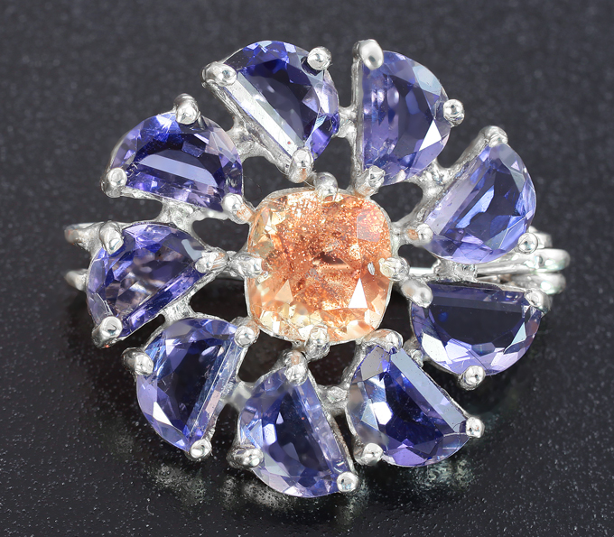 Вашему вниманию предлагается брошь из стерлингового серебра (925 проба) c чистейшим орегонским солнечным камнем с шиллер-эффектом и иолитами авторской огранки! Площадка 22 х 21 мм. Вес изделия 3,5 г. Ниже приводятся ювелирные характеристики вставок.