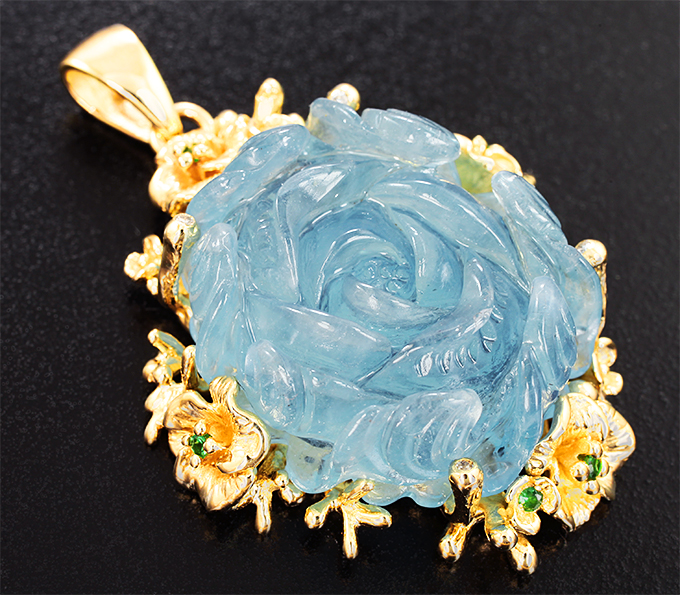 Кулон с резным аквамарином 34,55 карата, цаворитами и бриллиантами