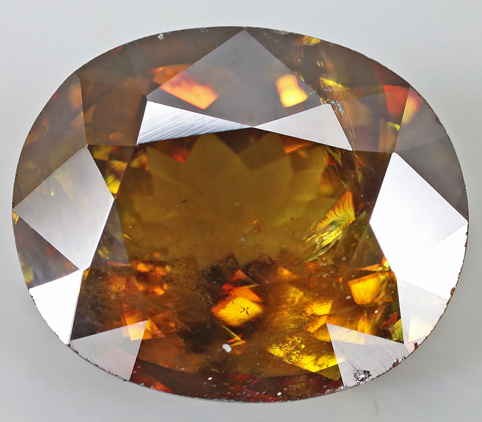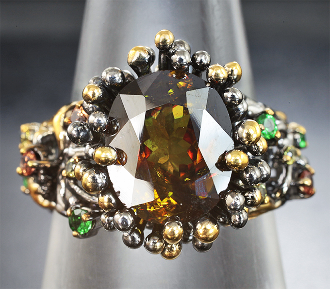 Кольцо с крупным сфеном 4,15 карата, цаворитами, желтыми и оранжевыми сапфирами