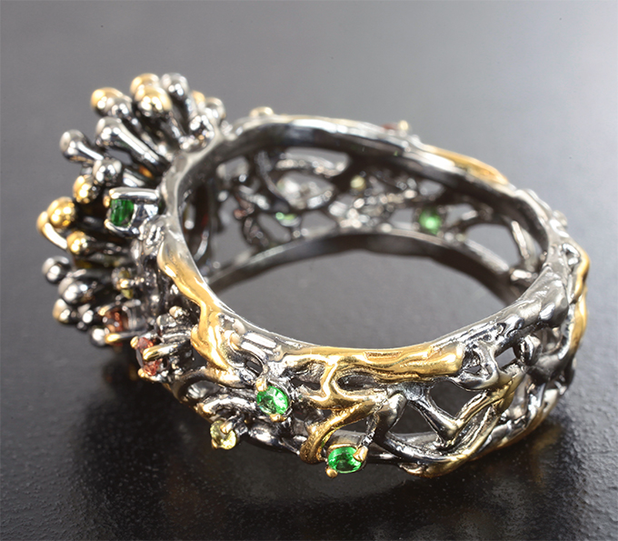 Вашему вниманию предлагается кольцо из стерлингового серебра (925 проба) c крупным сфеном, цаворитами гранатами, желтыми и оранжевыми сапфирами! Изделие с чернением и позолотой. Диаметр дополнительной инкрустации от 1,5 мм до 2 мм. Площадка 24 х 17 мм, высота 8 мм. Вес изделия 8,41 г. Размер 18,5. Ниже приводятся ювелирные характеристики сфена.