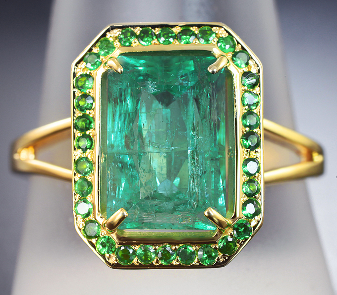 Кольцо с уральским изумрудом 3,14 карата и цаворитами