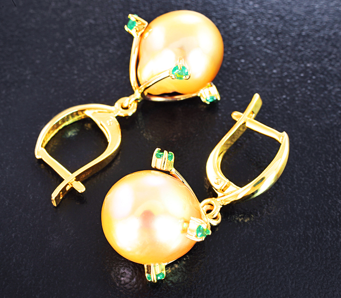 Серьги с золотистым жемчугом 23,84 карата и изумрудами