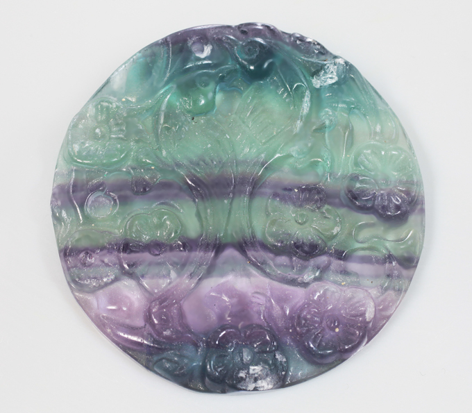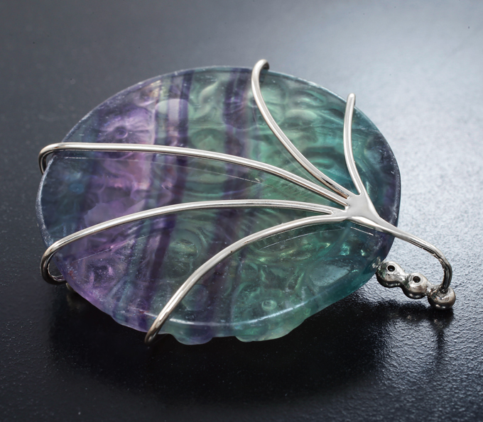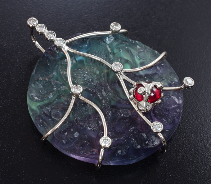 Кулон с резным многоцветным флюоритом 101,09 карата, кабошоном рубина 2,39 карата, муассанитами и бесцветными цирконами