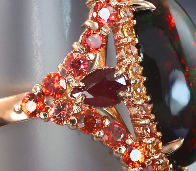 Кольцо с кристаллическим черным опалом 9,98 карата, рубинами, оранжевыми и желтыми сапфирами
