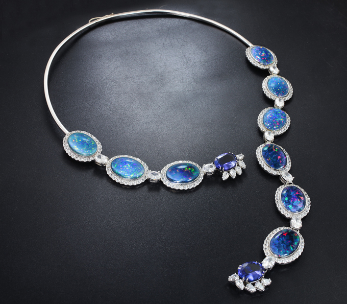 Колье с австралийскими триплет опалами 62,96 карата, чистейшими танзанитами, муассанитами, и бесцветными цирконами