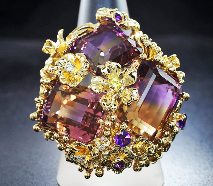 Кольцо с резными аметринами 29,36 карата, аметистами, желтыми сапфирами и бриллиантами