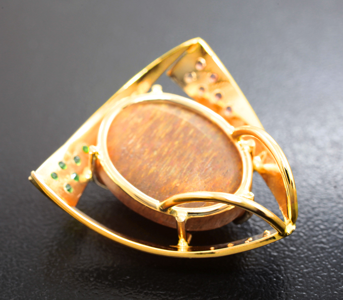 Кулон с солнечным камнем с эффектом кошачьего глаза 15,03 карата, сапфирами, цаворитами гранатами и бриллиантами