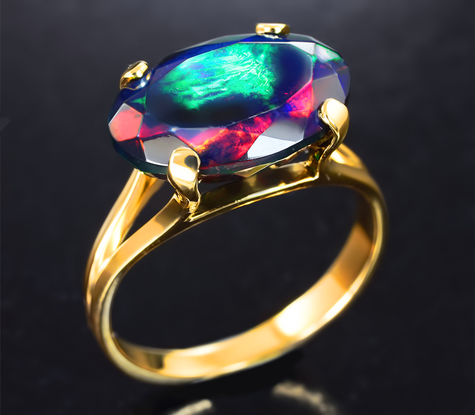 Вашему вниманию предлагается комплект (кольцо + подвесы для серег) из желтого золота 750 пробы с ограненными черными опалами 10,93 карата! Основные цвета опалесценции: красный, желтый и зеленый. Размеры вставок 13 х 10 мм и 14 х 10 мм. Вес комплекта 6,74 г.