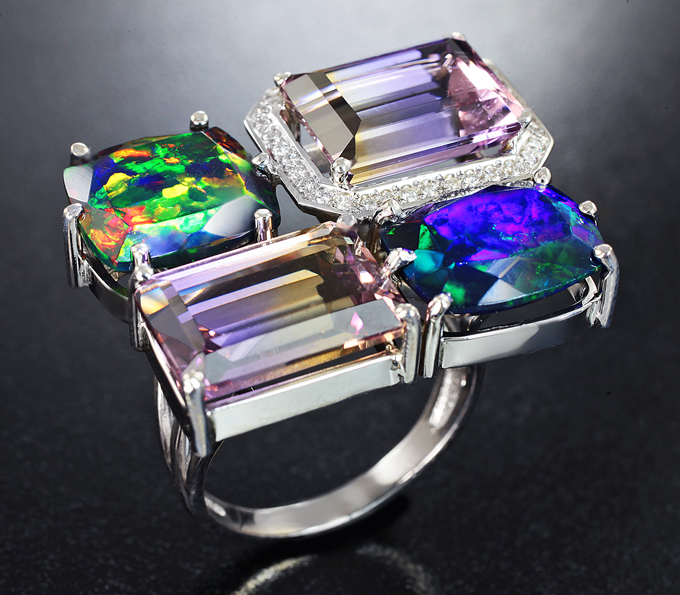 Кольцо с контрастными аметринами 10,33 карата, ограненными черными опалами 5,45 карата и бриллиантами
