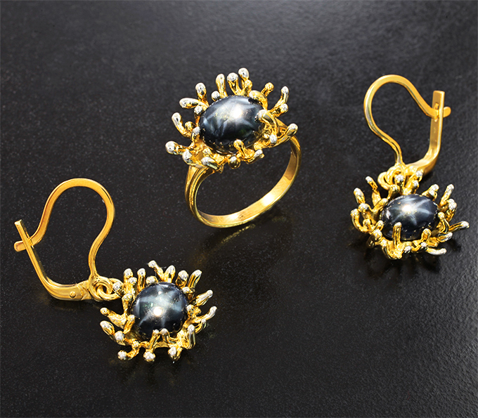 Вашему вниманию предлагается комплект (кольцо + серьги) из стерлингового серебра (925 проба) со звездчатыми сапфирами! Изделия частично позолочены. Размеры вставок 10 х 9 мм. Вес комплекта 12,27 г.