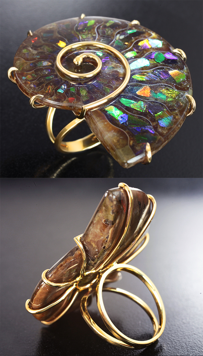 Вашему вниманию предлагается комплект (кольцо + серьги + кулон) из желтого золота 585 пробы с аммонитами с аммолитовой мозаикой 178,16 карата! Размеры вставок от 24 х 20 мм до 44 х 34 мм. Вес комплекта 49,31 г.