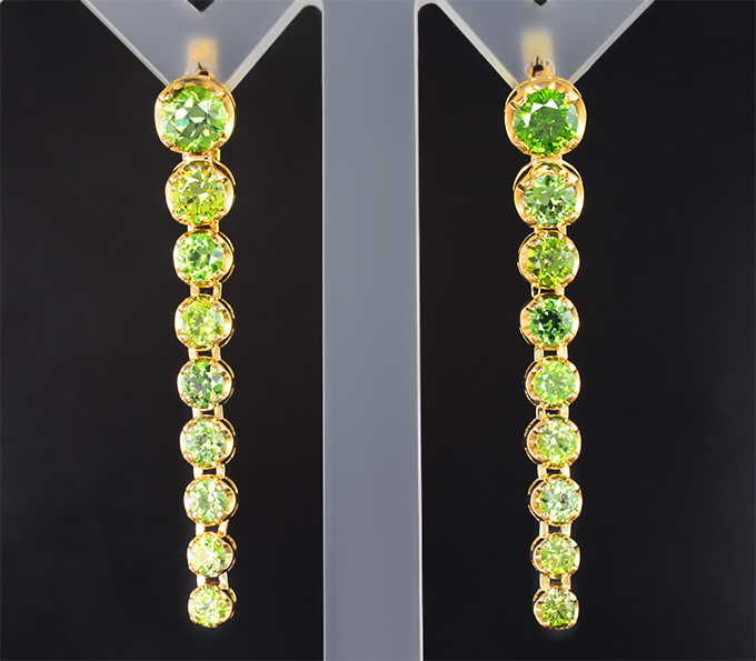 Вашему вниманию предлагаются серьги из желтого золота 585 пробы с уральскими демантоидами! Площадка серег 45 х 6 мм. Вес пары 7,89 г. Ниже приводятся ювелирные характеристики вставок.