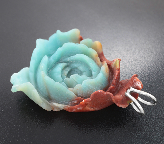 Вашему вниманию предлагается замечательный образец камнерезного искусства – миниатюра-подвеска «Пион» из цельного полихромного амазонита с петлей из серебра 925 пробы! Ручная работа! Не подвергалась окрашиванию. Размеры 61 х 45 х 15 мм. Вес 31,71 г.