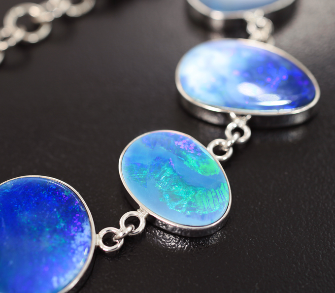 Вашему вниманию предлагается браслет из белого золота 585 пробы с австралийскими дублет опалами! Основные цвета опалесценции - синий и фиолетовый. Длина браслета от 155 мм до 195 мм, ширина 20 мм. Вес изделия 17,2 г. Ниже приводятся ювелирные характеристики.
