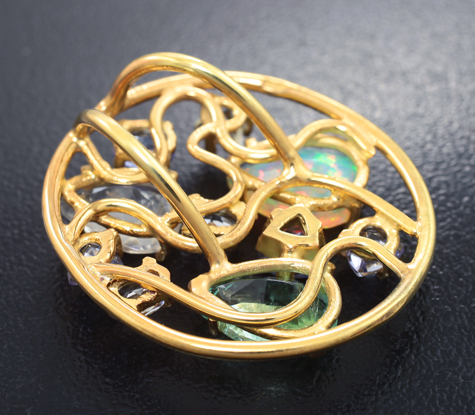 Кулон с «неоновым» уральским изумрудом 1,76 карата, ограненным эфиопским опалом 1,26 карата, лунным камнем 1,22 карата и танзанитами 1,67 карата