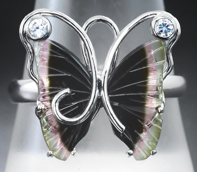 Кольцо с резными турмалинами 2,27 карата и бесцветными цирконами