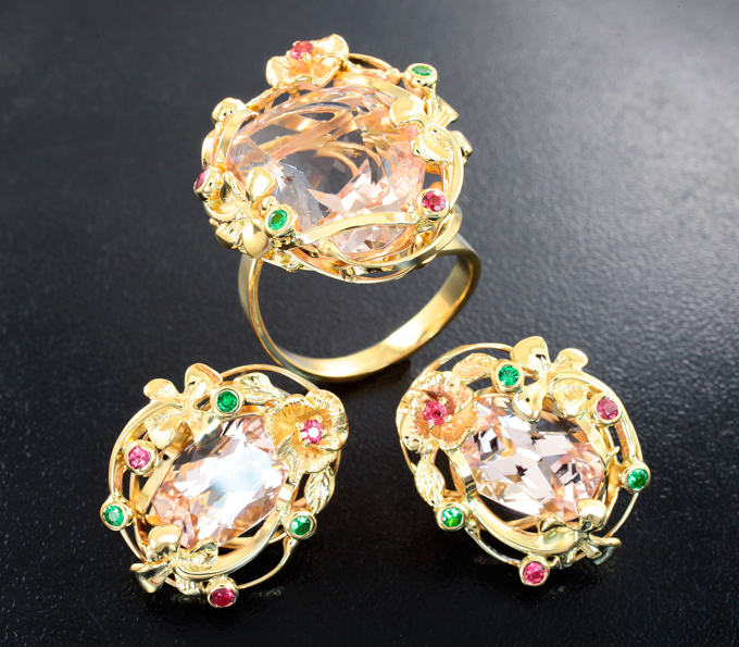 Вашему вниманию предлагается комплект (кольцо + серьги) из желтого золота 585 пробы с морганитами, цаворитами гранатами и рубинами! Диаметр дополнительной инкрустации от 1,5 мм до 2,1 мм. Вес комплекта 22,47 г.