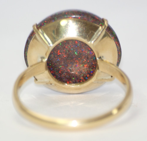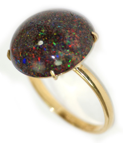 Кольцо из желтого 18-каратного золота (750 проба) с драгоценным черным опалом весом 10,28 карата. Высота площадки 8,8 мм, ширина 16,5 мм. Вес изделия 6,5 г. Размер 18,5.