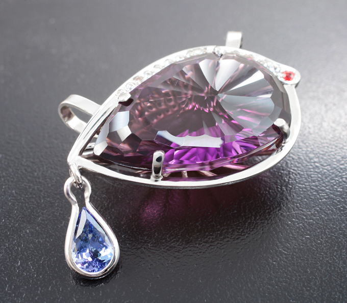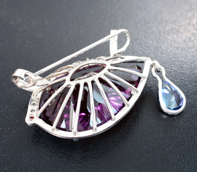 Брошь с аметистом лазерной огранки 34,83 карата, танзанитом, красным и бесцветными сапфирами