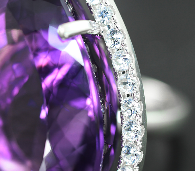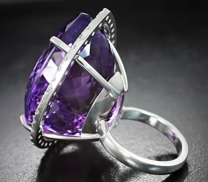 Кольцо с чистейшим крупным аметистом 66,83 карата и бесцветными цирконами