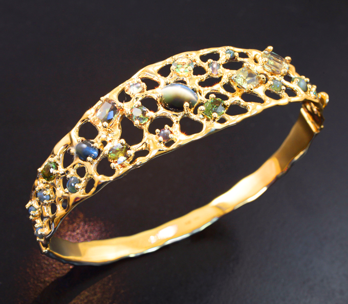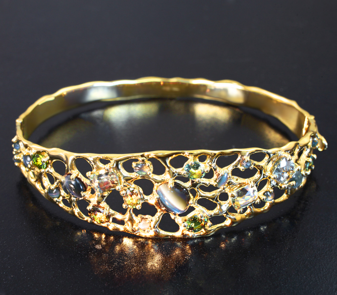 Вашему вниманию предлагается браслет из желтого золота 585 пробы с хризобериллом с эффектом кошачьего глаза, уральскими александритами и диаспорами! Длина браслета по внутренней окружности 180 мм, ширина 19 мм. Вес изделия 22,1 г. Ниже приводятся ювелирные характеристики вставок.
