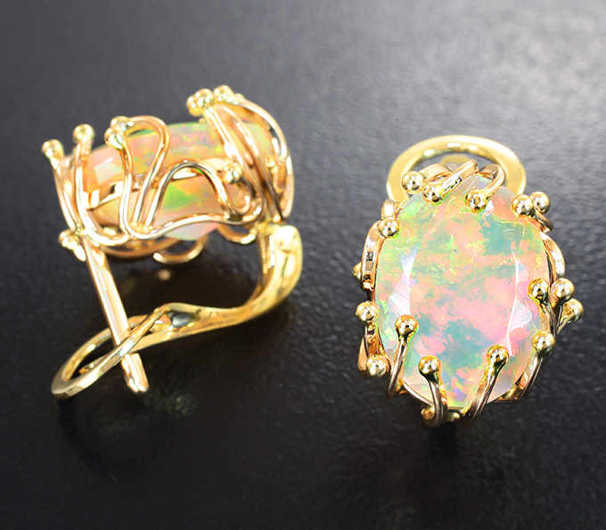 Вашему вниманию предлагаются серьги из желтого золота 585 пробы с огранеными эфиопскими опалами! Основные цвета опалесценции: красный, желтый, зеленый и фиолетовый. Площадка серег 16 х 13 мм. Вес пары 6,89 г. Ниже приводятся ювелирные характеристики вставок.