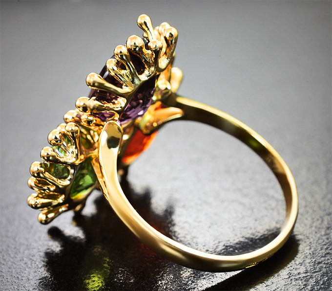 Вашему вниманию предлагается кольцо из желтого золота 585 пробы с крупым зеленым сфеном, спессартином «фанта» и скаполитом топового цвета! Площадка 26 х 26 мм, высота 7 мм. Вес изделия 8,52 г. Размер 19,5. Ниже приводятся ювелирные характеристики вставок.