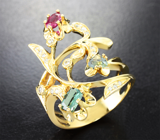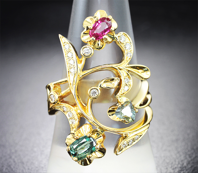Вашему вниманию предлагается кольцо из желтого золота 585 пробы с уральскими александритами, рубином и бриллиантами! Диаметр дополнительной инкрустации 1,1 мм и 1,5 мм. Площадка 30 х 21 мм, высота 4 мм. Вес изделия 7,71 г. Размер 18,5.