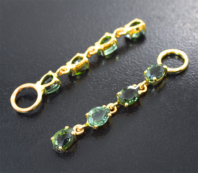 Вашему вниманию предлагаются подвесы для серег из желтого золота 585 пробы с турмалинами! размеры изделия 35 х 7 мм. Вес пары 2,19 г. Ниже приводятся ювелирные характеристики.