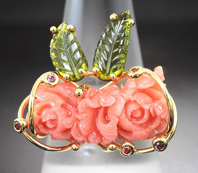 Вашему вниманию предлагается кольцо из желтого золота 585 пробы c резным solid кораллом, зеленым турмалином и сапфирами! Размеры дополнительной инкрустации 1,5 мм до 12 х 5 мм. Площадка 26 х 23 мм, высота 10 мм. Вес изделия 6,47 г. Размер 17,5. Ниже приводятся ювелирные характеристики вставки.