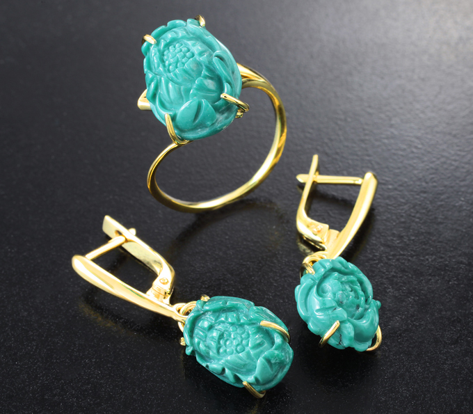 Вашему вниманию предлагается комплект (кольцо + серьги) из желтого золота 585 пробы с резной армянской бирюзой 16,44 карата! Размеры вставок 13 х 10 мм и 15 х 11 мм. Вес комплекта 7,77 г.