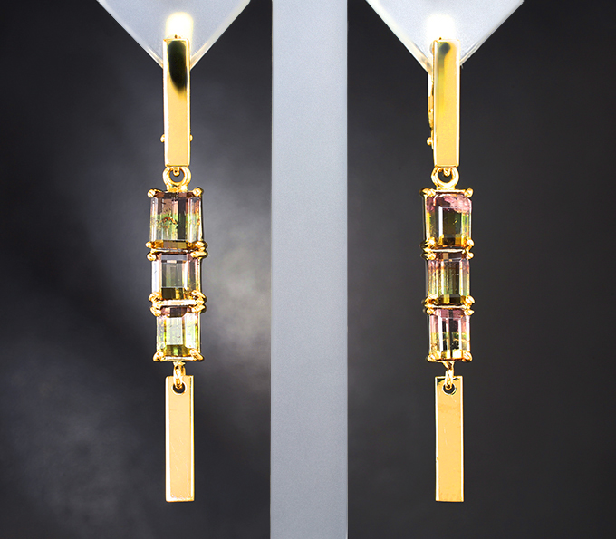 Вашему вниманию предлагаются серьги из желтого золота 585 пробы с полихромными турмалинами! Размеры серег с петлей 48 х 6 мм. Вес пары 6,05 г. Ниже приводятся ювелирные характеристики.