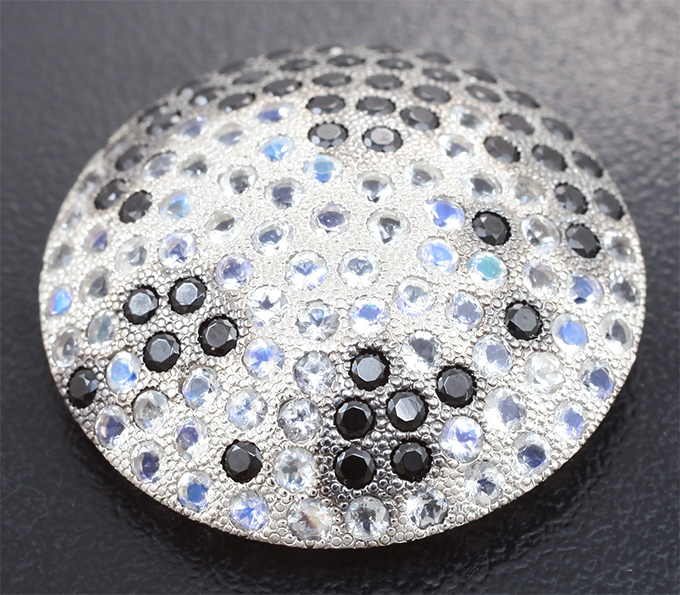Вашему вниманию предлагается кулон из белого золота 585 пробы с ограненным лунным камнем и черными шпинелями! Диаметр вставок 2 мм. Диаметр кулона 29 мм. Вес изделия 7,45 г.