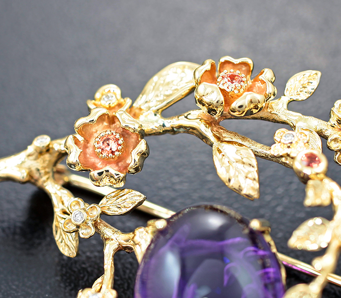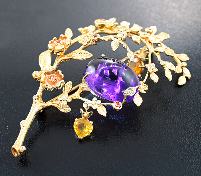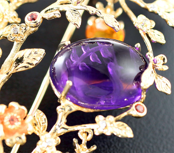 Брошь с резным аметистом 11,6 карата, цветными сапфирами и бриллиантами