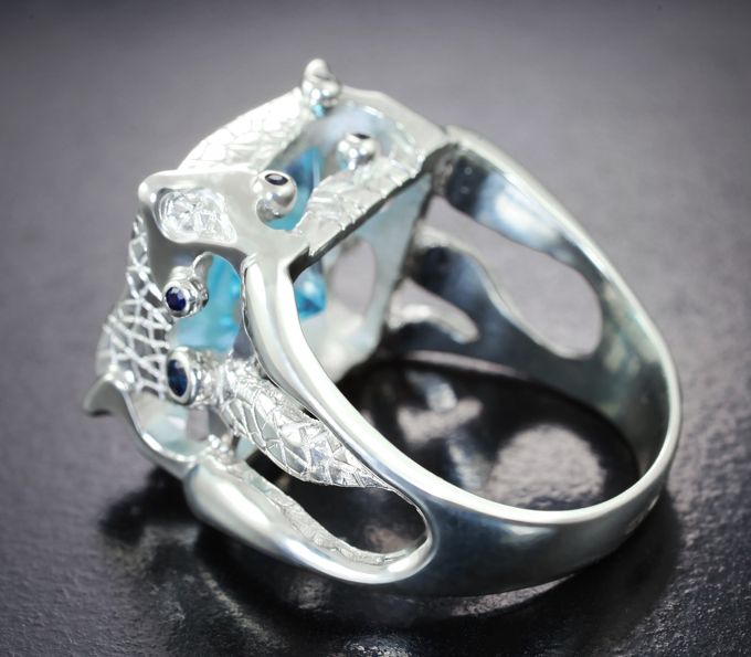 Кольцо с чистейшим голубым топазом 10,76 карата и синими сапфирами