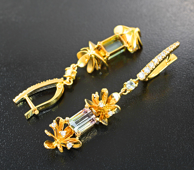 Вашему вниманию предлагаются серьги из желтого золота 585 пробы с арбузными турмалинами и бесцветными цирконами! Диаметр дополнительной инкрустации от 1 мм до 3 мм. Размеры серег с петлей 53 х 11 мм. Вес пары 9,23 г. Ниже приводятся ювелирные характеристики вставок.