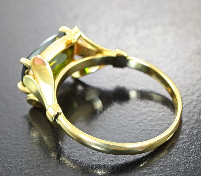 Вашему вниманию предлагается кольцо из желтого золота 585 пробы с зеленым сфеном высокой дисперсии! Площадка 13 х 10 мм, высота 6 мм. Вес изделия 3,42 г. Размер 18,5. Ниже приводятся ювелирные характеристики вставки.