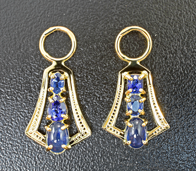 Вашему вниманию предлагаются подвесы для серег из желтого золота 585 пробы с сапфирами! Размеры изделия 24 х 13 мм. Вес пары 2,62 г. Ниже приводятся ювелирные характеристики вставок.