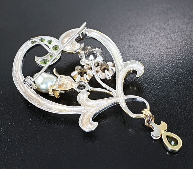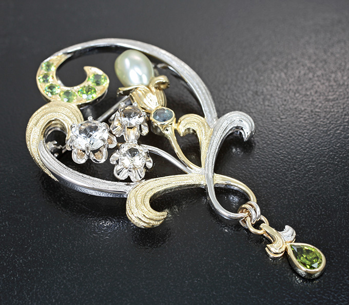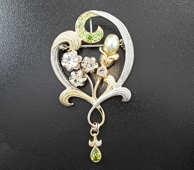 Брошь/кулон с уральским александритом 0,25 карата, хризобериллом, уральскими демантоидами, пастельно-оранжевыми фенакитами и жемчужиной Keshi
