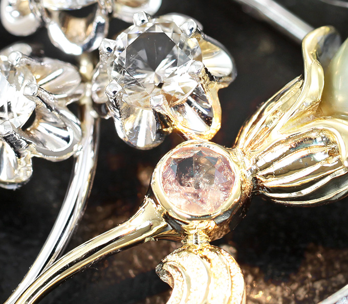 Вашему вниманию предлагается брошь/кулон из желтого и белого золота 585 пробы с уральским александритом 0,25 карата, хризобериллом, уральскими демантоидами, ограненными пастельно-оранжевыми фенакитами и жемчужиной Keshi! Диаметр александрита 4 мм. Площадка 64 х 35 мм. Вес изделия 14,9 г.
