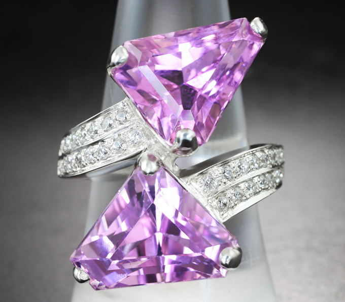 Кольцо с кунцитами авторской огранки 18,49 карата и бесцветными цирконами