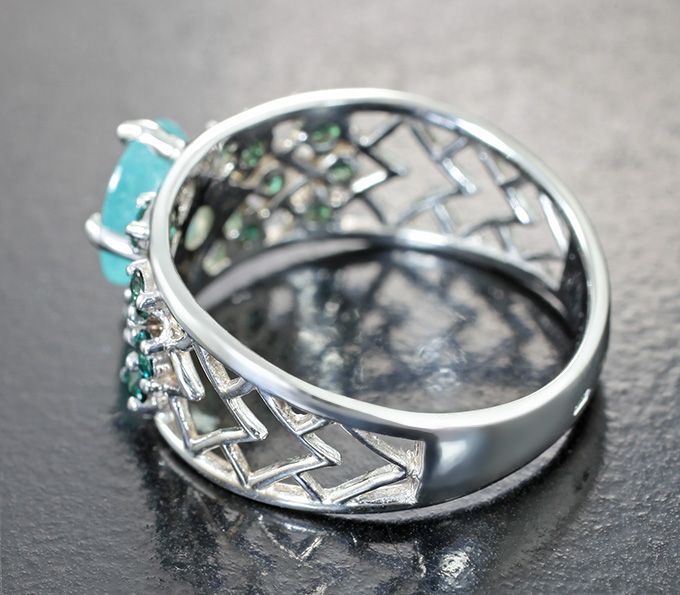 Вашему вниманию предлагается кольцо из белого золота 585 пробы с параиба турмалином и гранатами со сменой цвета! Диаметр дополнительной инкрустации 2,1 мм. Ширина площадки 9 мм, высота 4 мм. Вес изделия 3,57 г. Размер 17,5. Ниже приводятся ювелирные характеристики центральной вставки.