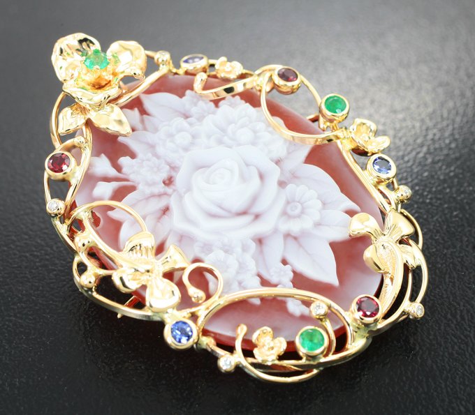 Брошь с агатовой камей на карнелиане 24,61 карата, синими и красными сапфирами, изумрудами и бриллиантами