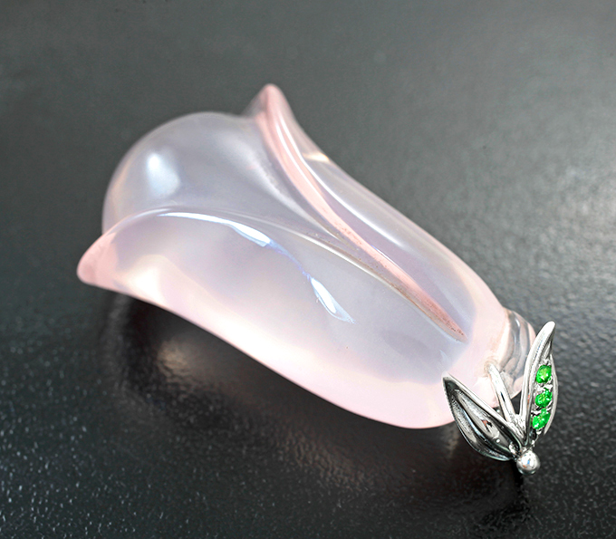 Вашему вниманию предлагается кулон из стерлингового серебра (925 проба) с крупным розовым кварцем и цаворитами! Диаметр дополнительной инкрустации 1,5 мм. Размеры кулона с петлей 52 х 23 мм. Вес изделия 19,46 г. Ниже приводятся ювелирные характеристики вставки.