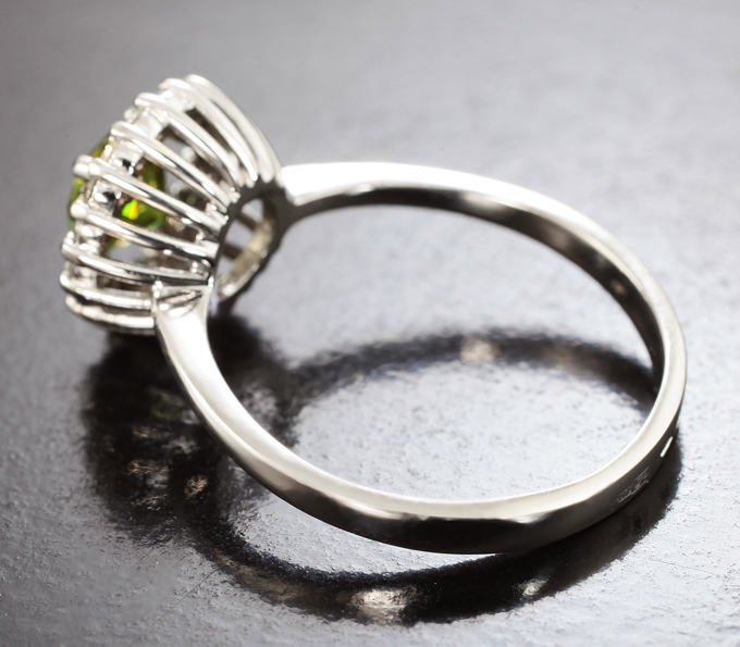 Вашему вниманию предлагается комплект (кольцо + пусеты) из белого золота 585 пробы с демантоидами гранатами и бриллиантами! Вес комплекта 6,38 г.