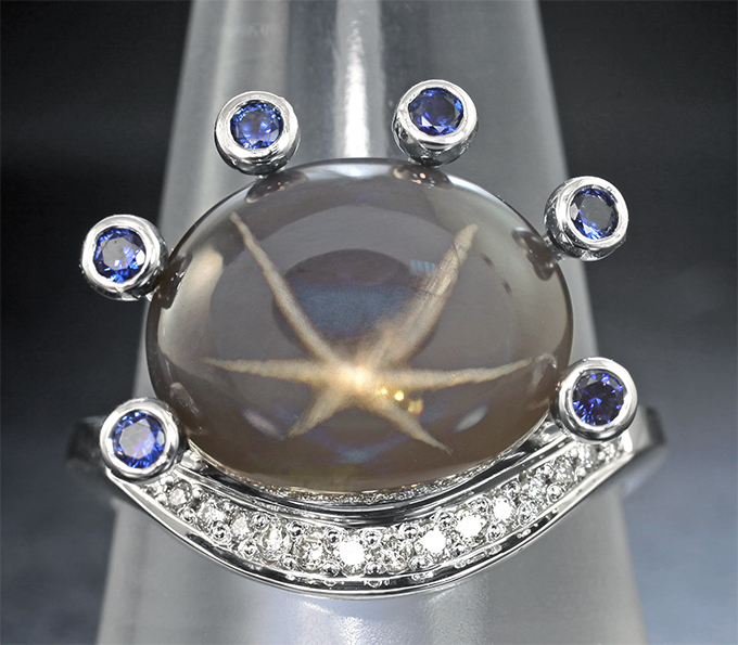 Кольцо с крупным звездчатым сапфиром 13,5 карата, синими сапфирами и бриллиантами