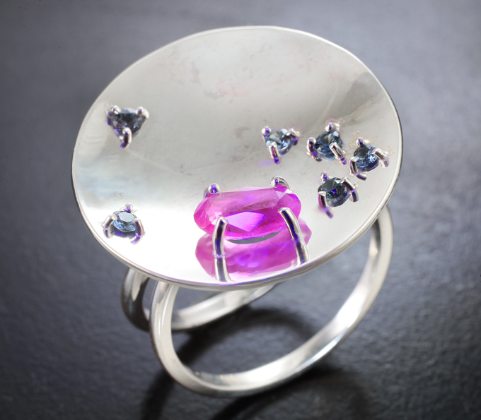Кольцо с ограненным хакманитом топовых цветовых характеристик 0,65 карата и гранатами со сменой цвета
